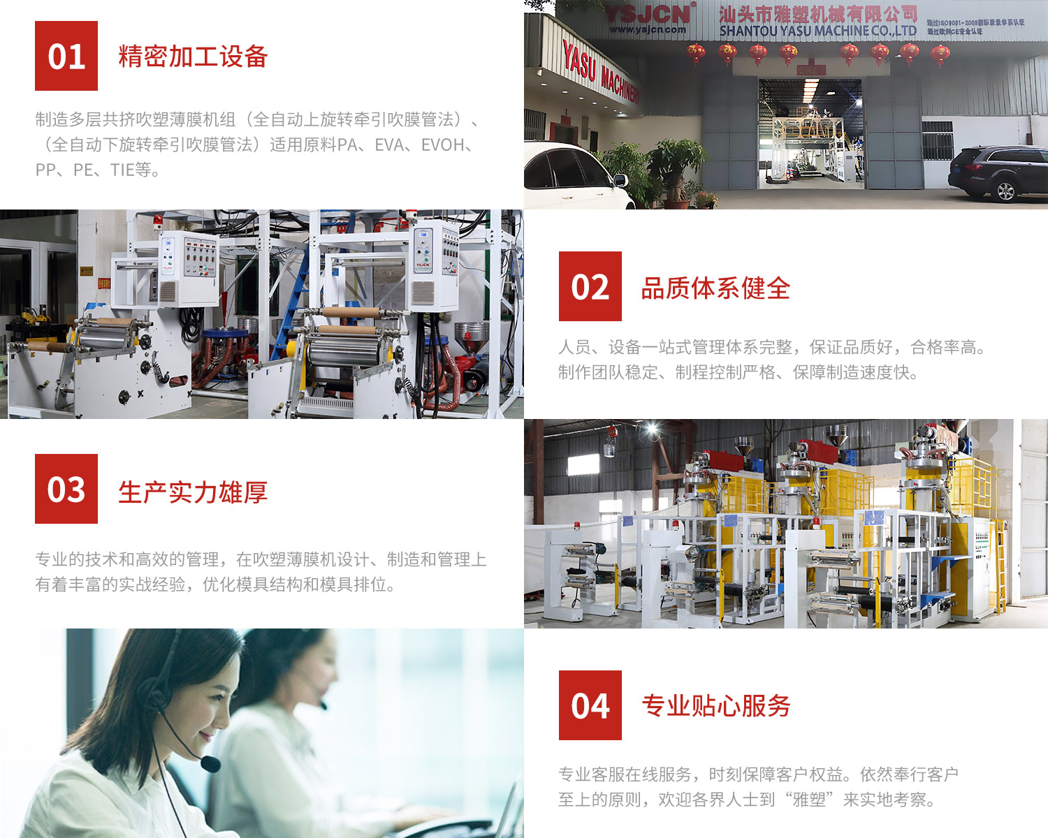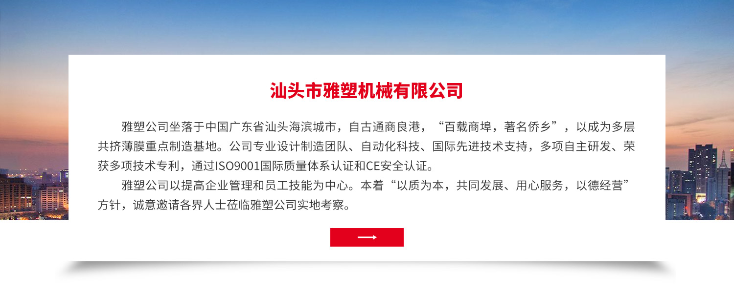 廣東省汕頭市雅塑機械有限公司網站正式上線! 雅塑公司坐落于中國廣東省汕頭海濱城市,自古通商良港,“百載商埠,著名僑鄉”,以成為多層共擠薄膜重點制造基地。